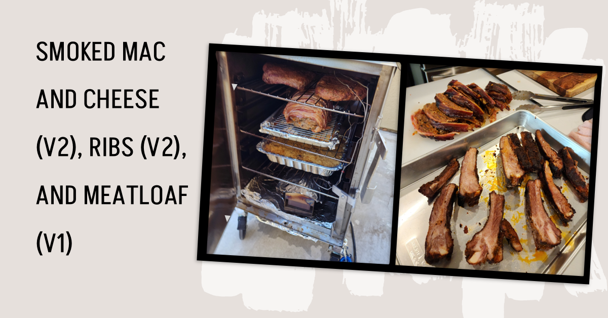 Everything turned out quite well! I smoked the mac and cheese for a little less time (1hr 20m), so the smokiness wasn’t nearly as overpowering as it was in v1, and the block cheese and cream definitely made a difference; v2 was clearly better than v1. The meatloaf tasted the same as usual, but you could taste a slight smoky flavor. The only mistake was I used my usual spice rub on the spare ribs. Since they were already marinated, they ended up being a tad too salty.